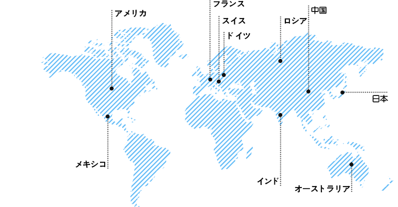 アメリカ、ドイツ、日本、スイス、インド、ロシア、メキシコ、フランス、オーストラリア